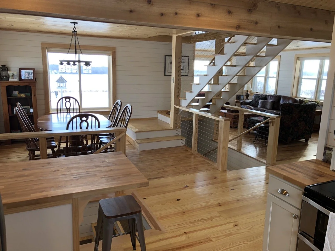 BEDROOMS and BATHROOMS: There is one bedroom with a queen bed on the main level and two bedrooms upstairs, one with a king bed and the other with two twins. Full bathrooms with tiled showers on main and upper levels. There is also an additional room upstairs for reading or kids play.